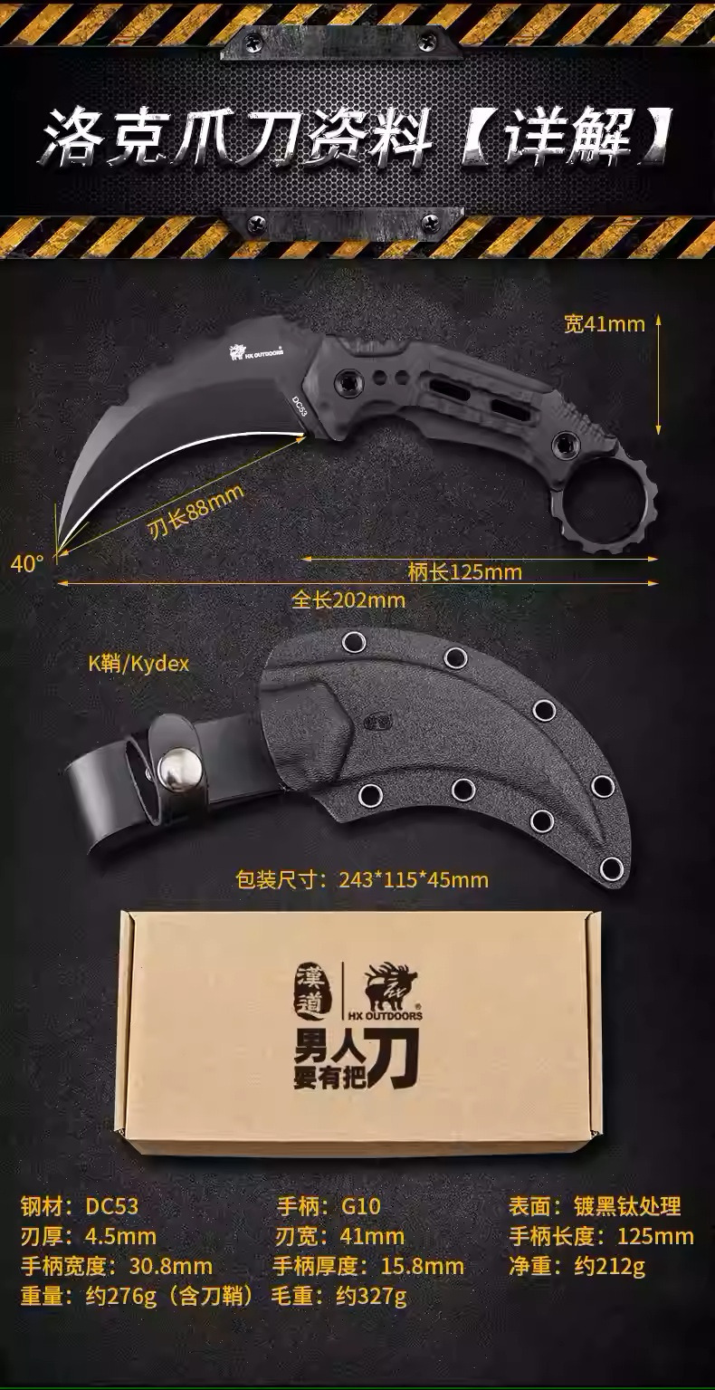 漢道 HX OUTDOORS 洛克DC53一體鍛造多功能戰術龍爪刀 規格: 重量:276g 尺寸:長度20.2CM/刃厚4.5mm/刃長8.8CM 鋼材:DC53一體鍛造-鍍鈦黑加工 G10玻璃纖維輕量防滑手柄