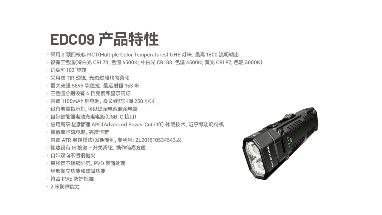 NITECORE EDC09 搭載全新 MCT多色溫高顯色燈珠,一支燈直接整合 三種色溫 + 三種顯色表現,不用再為不同場景準備多支手電筒。